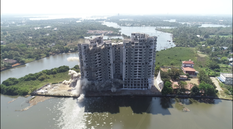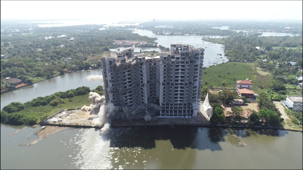 The three high-rise apartment buildings were the 20-storey Holy Faith H2O, the 18-storey Jains Coral Cove, and the 16-storey Golden Kayaloram. The former was imploded successfully on Saturday 11 January 2020, while the latter two were imploded successfully on Sunday 12 January 2020. All three buildings were located within 1.5 km of each other.